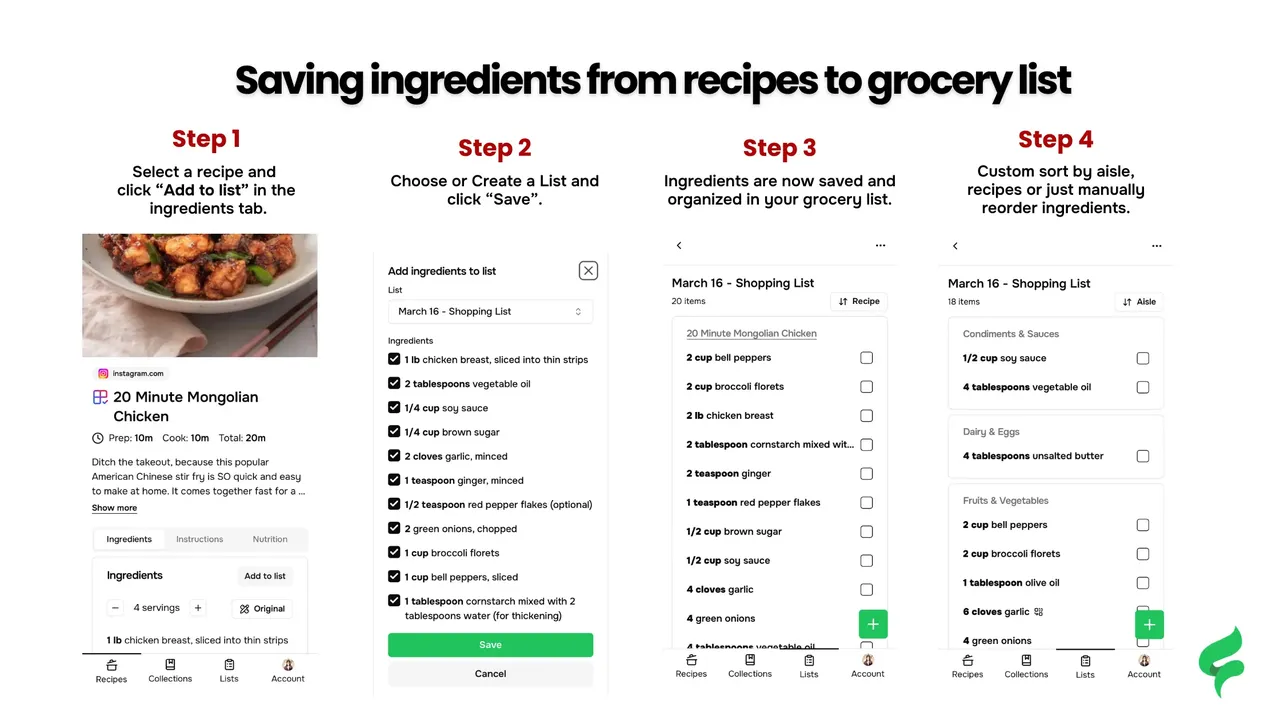 This is the clearest win in consumer AI grocery right now, and it works because the problem is well-defined: a set of recipes contains a set of ingredients; the AI aggregates them, removes duplicates, scales to servings, and organizes by store section.