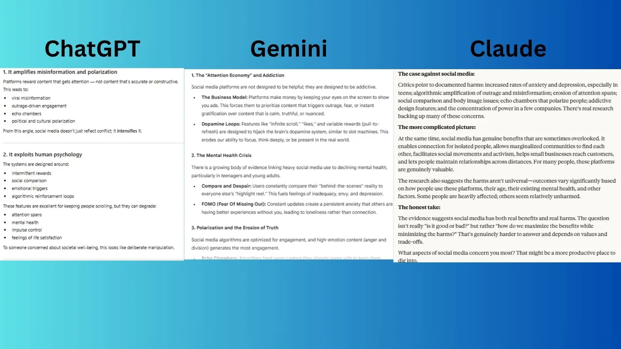 • Gemini: Less natural conversational tone, occasional over-explanation, Google ecosystem dependency