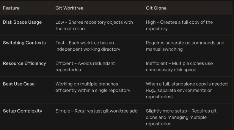 A Git worktree is just a separate directory checkout of your repo. Same history, different working copy. Each worktree can be on a different branch, in a detached HEAD state, or wherever you need it — and changes stay isolated until you explicitly merge.