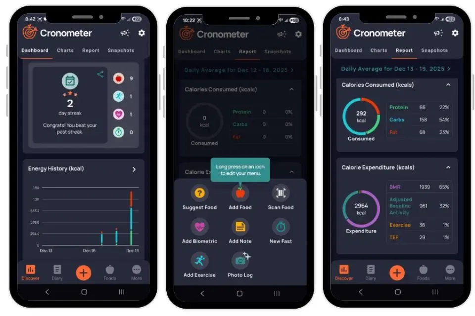 Not the flashiest AI, but the most reliable data. Cronometer uses a nutritionist-verified food database — not crowdsourced entries — which means when you manually log a food, the numbers are accurate. Free tier includes unlimited logging with no daily cap, full macro and micronutrient breakdown, and a barcode scanner. The AI photo recognition is available on the paid Gold tier ($8.99/month). For most people, the free manual logging with a verified database produces better outcomes than AI photo estimation from an unverified one.