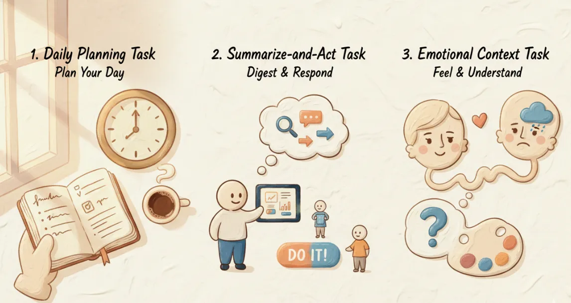 Prompt I used: I pasted a 900‑word mishmash from my notes: a recipe idea, two to‑dos from a call, and a half-drafted message to a friend. Then I asked: "Summarize each strand in 1–2 lines, pull out action items with deadlines, and draft a text I can actually send."