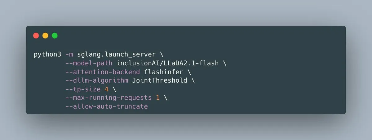 Discrete diffusion LMs aren't a new concept — but a 100B open-source version is rare. SGLang's day-one support means the inference stack is ready. If you want to experiment with non-autoregressive generation at scale, this is the clearest on-ramp right now.