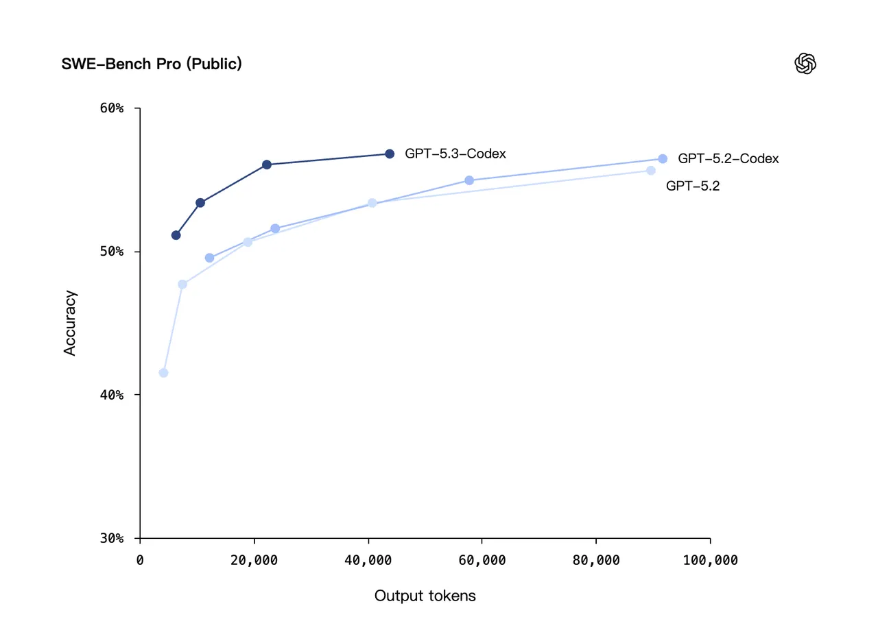GPT-5.3 Codex handled this better than I expected. According to OpenAI's benchmark data, it achieves 56.8% on SWE-Bench Pro (spanning four programming languages) and uses fewer tokens than previous models.