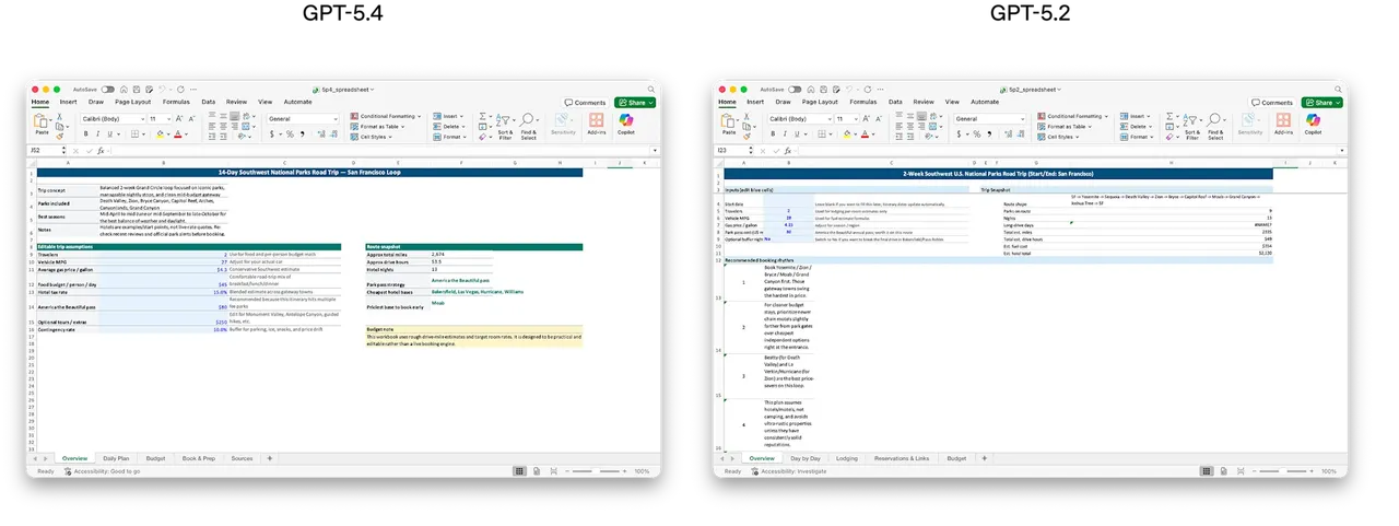 • Presentations: Human raters preferred GPT-5.4's presentations 68.0% of the time over GPT-5.2's, citing stronger aesthetics, greater visual variety, and more effective use of image generation.