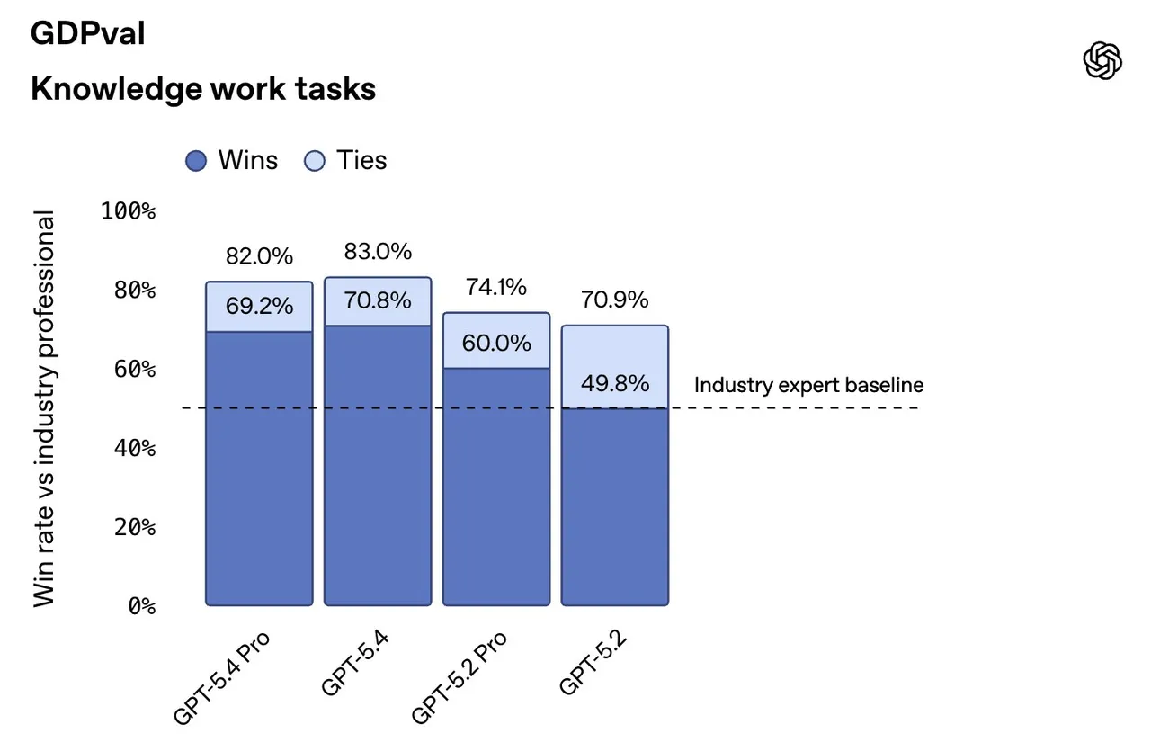 On GDPval, which tests agents' abilities to produce well-specified knowledge work across 44 occupations, GPT-5.4 achieves a new state of the art, matching or exceeding industry professionals in 83.0% of comparisons, compared to 70.9% for GPT-5.2.