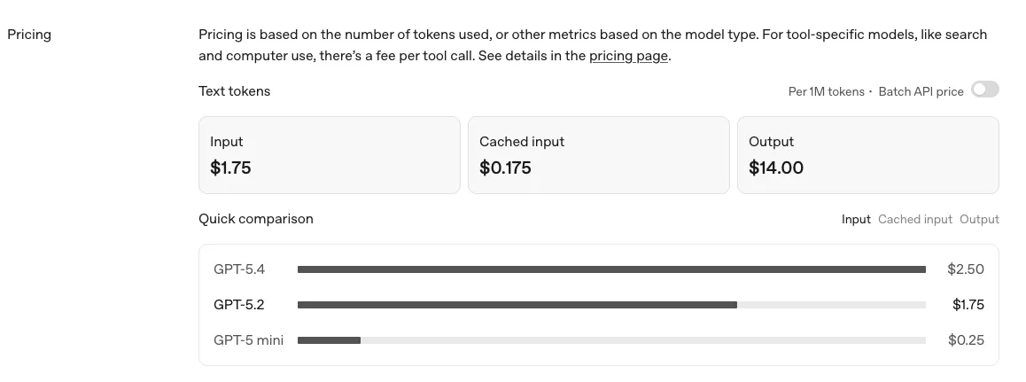 Also worth noting: Batch API pricing applies at half the standard rate for both models, and the double-rate threshold for long inputs kicks in at 272K tokens for GPT-5.4. If your average prompt is under that threshold, the nominal pricing above is what you'll pay.