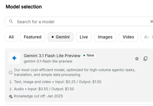 • Confirm the exact model ID: gemini-3.1-flash-lite-preview (copy it, don't type it)