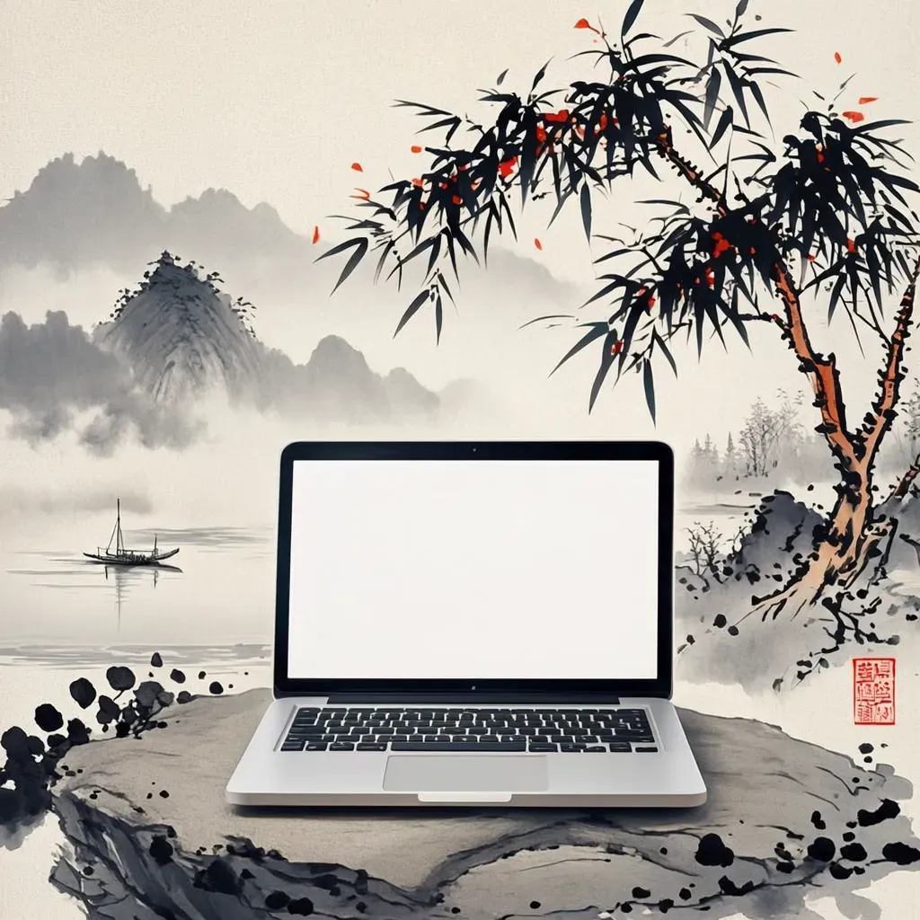 • My Prompt: A traditional ink wash painting (Shanshui) style, but featuring a modern laptop on a rock.