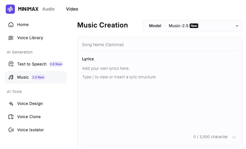 Technical limits (Feb 2026): lyrics field accepts 1–3,500 characters for music-2.5.