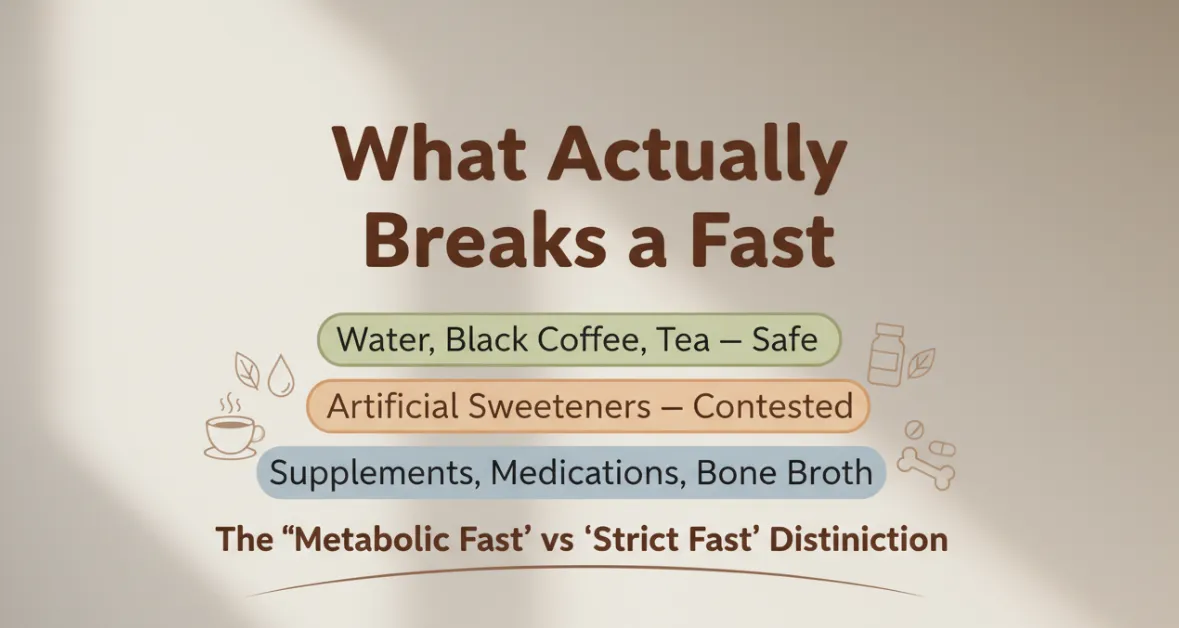 Bone broth: Contains calories and protein. It breaks a strict fast. But some people use it during longer fasts (24+ hours) to manage electrolytes and hunger. If you're doing standard 16:8, you don't need bone broth during your fasting window.