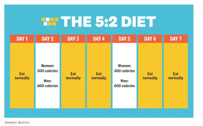 The basics: Eat normally five days a week. On two non-consecutive days, eat roughly 500–600 calories total.