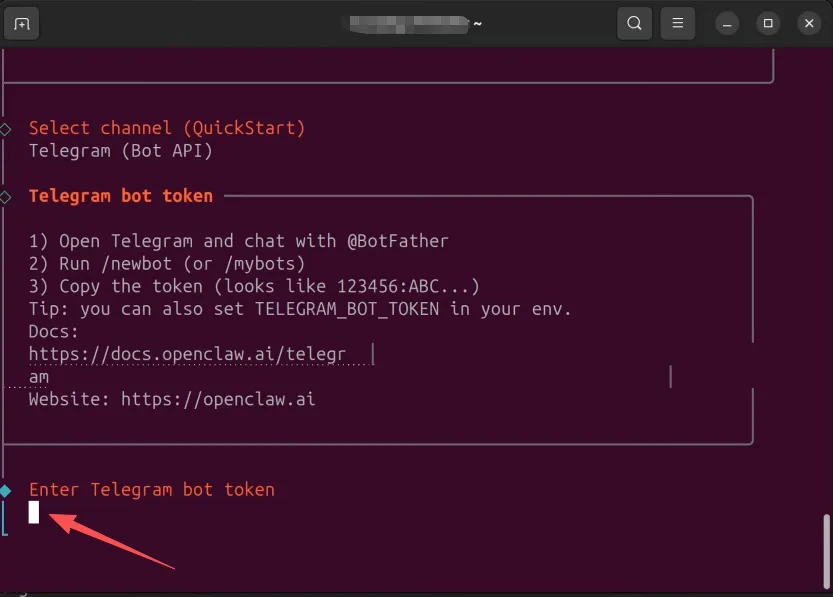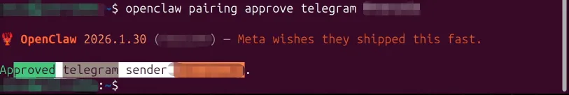 1. The bot sent me a pairing code in Telegram (something like "JF4MSY23"). I almost missed it because it came as a separate message.