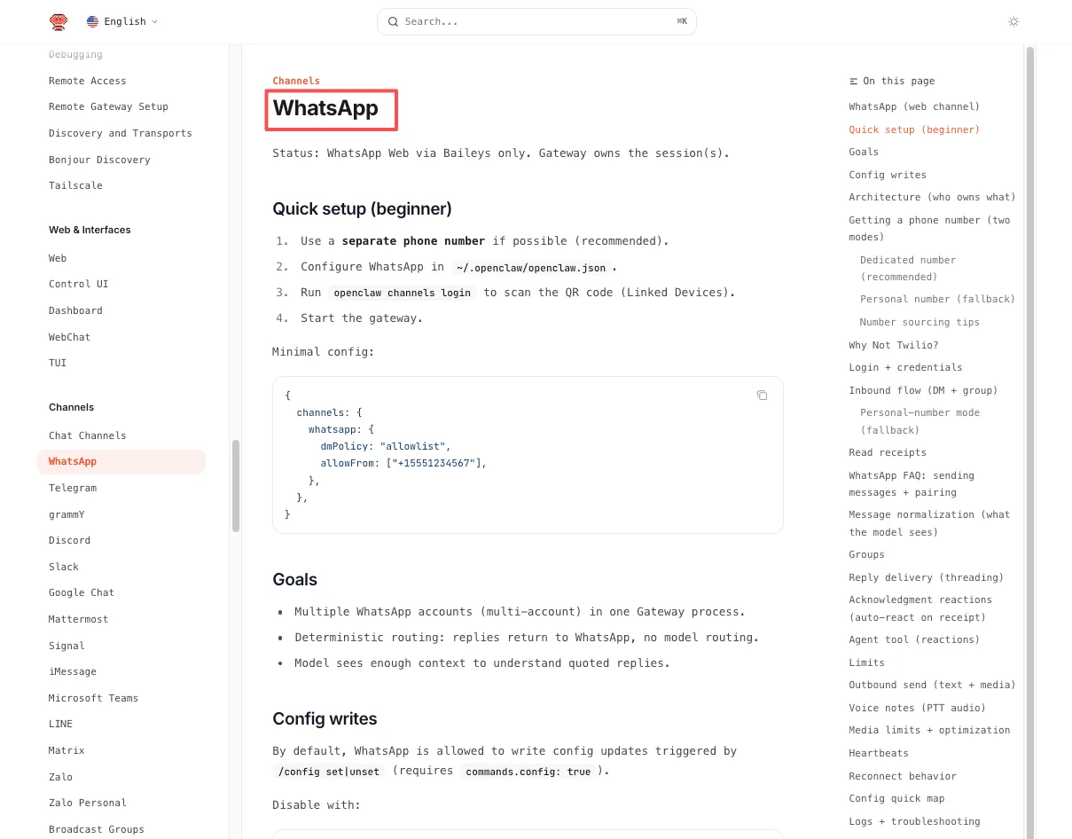 This is where theory meets friction. The setup uses the Baileys library to emulate WhatsApp Web. It's unofficial, which means it works — but it also means there are quirks. You should definitely keep the WhatsApp configuration docs open in another tab while you do this.
