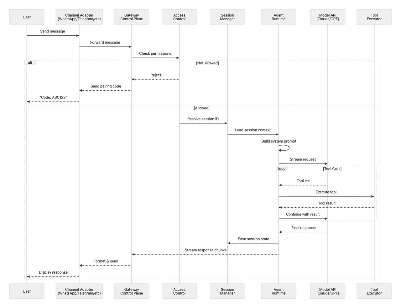 This matters for restarts. Because session state is written to disk, a Gateway restart doesn't wipe conversation history. The next message picks up where the session left off. That said — if the Gateway crashes mid-tool-call, the last incomplete turn won't be replayed. Check your session JSONL if you need to audit what got written.