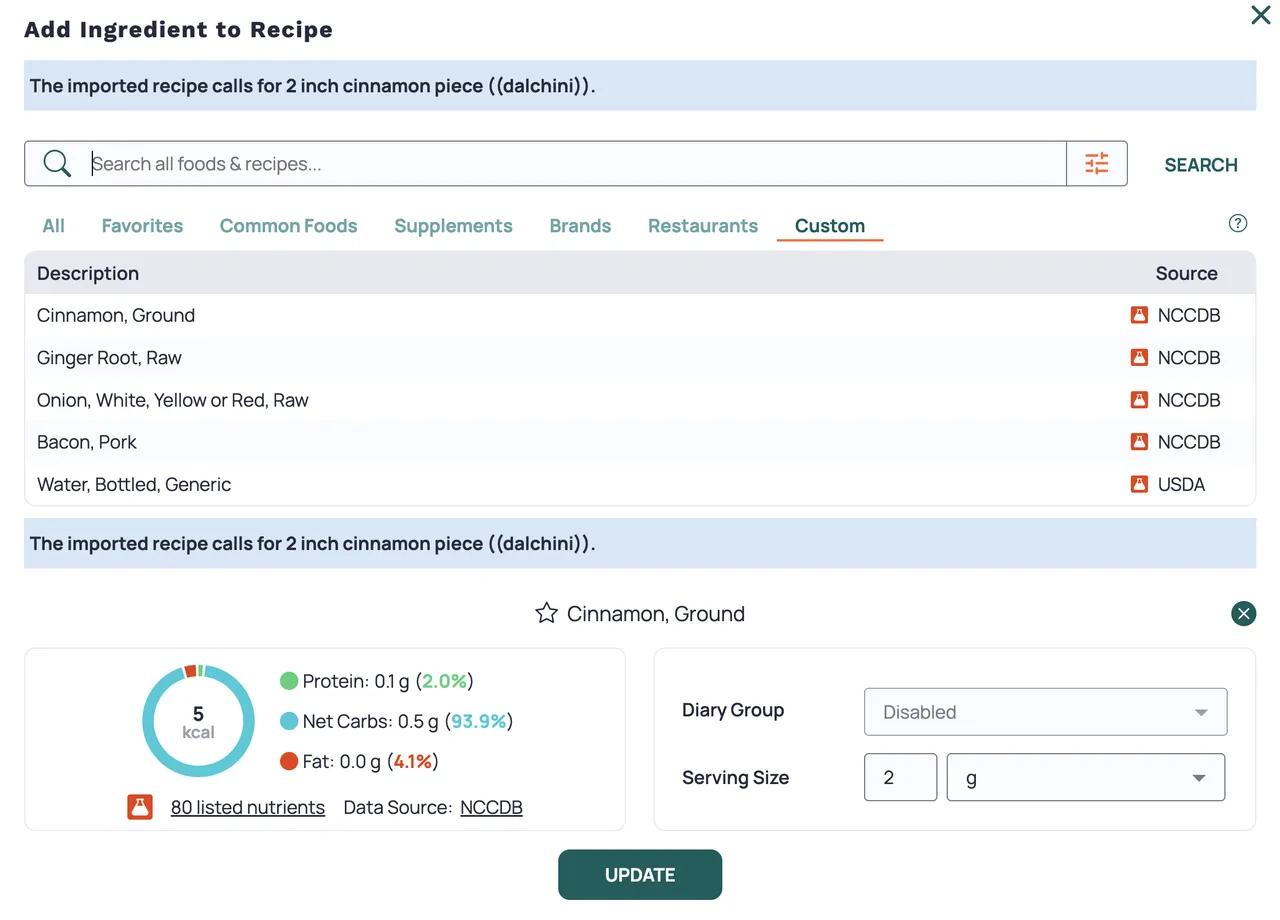 For ingredients where weight measurement isn't practical (a garlic clove, a bay leaf, a pinch of salt), the tool's internal conversion will estimate. Just know those are estimates.