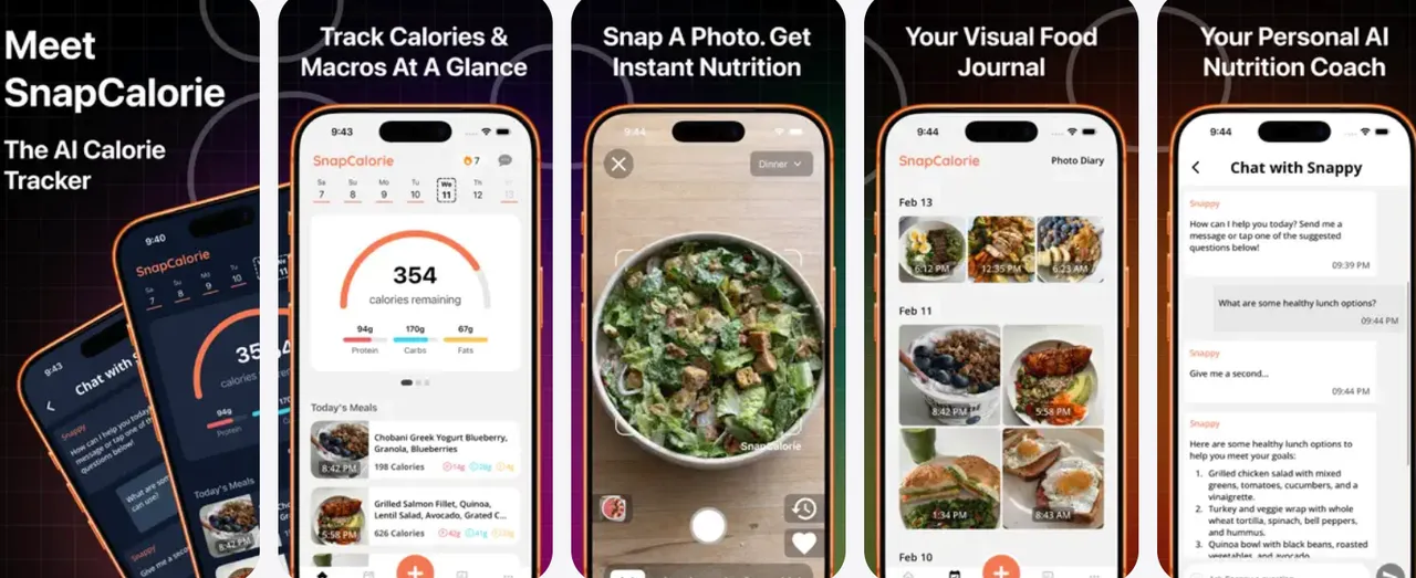 SnapCalorie lets you log meals by snapping a photo. The app recognizes foods (e.g., chicken, rice, greens), estimates portions, and maps them to a nutrition database to calculate calories and macros. You can edit labels, add missing items like sauces or nuts, adjust portions, and save to your daily log.