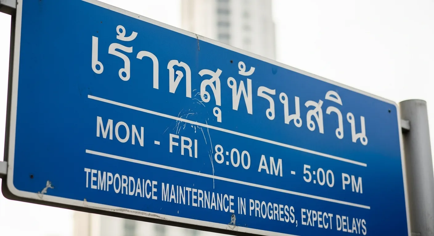 I took a quick photo from across the street. The letters were small, and the sign had a bright sky behind it, which didn't help. The first go was rough, partial words, odd spacing. I cropped the photo to just the sign and retried. Suddenly readable. The translation was basic but correct: service hours and a short notice about maintenance.