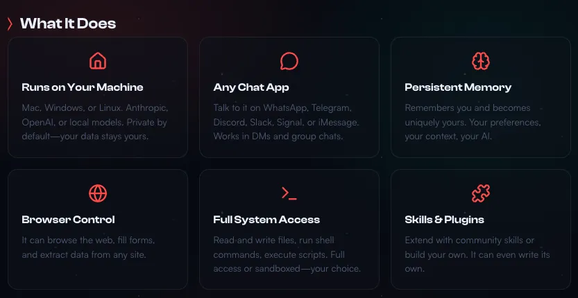 What problem it solves: If you're tired of cloud assistants that forget context, can't access your files, or won't execute real commands, OpenClaw runs locally and remembers everything across sessions.