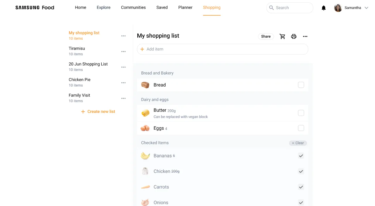 Samsung Food has 6 million users and the deepest grocery delivery integration of any tool in this category — 23 retailers. The free tier is genuinely generous: a full weekly calendar, 240,000+ recipes searchable by diet and ingredient, one-tap grocery list generation from your plan, and shared lists for households.