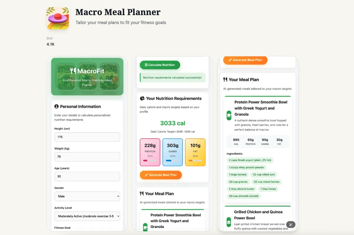 Dedicated generators solve the surrounding workflow — saving the plan, editing individual meals, generating a shoppable list, and remembering your profile so next week starts from where you left off instead of from scratch.