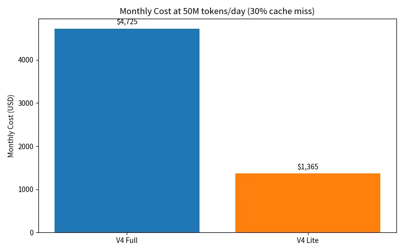 The key number: if V4 Lite prices near current V3.1 levels ($0.14–0.15/M input), you're looking at a ~2–3x cost reduction versus full V4 while retaining the same 1M context window. For high-volume pipelines, that difference compounds fast.