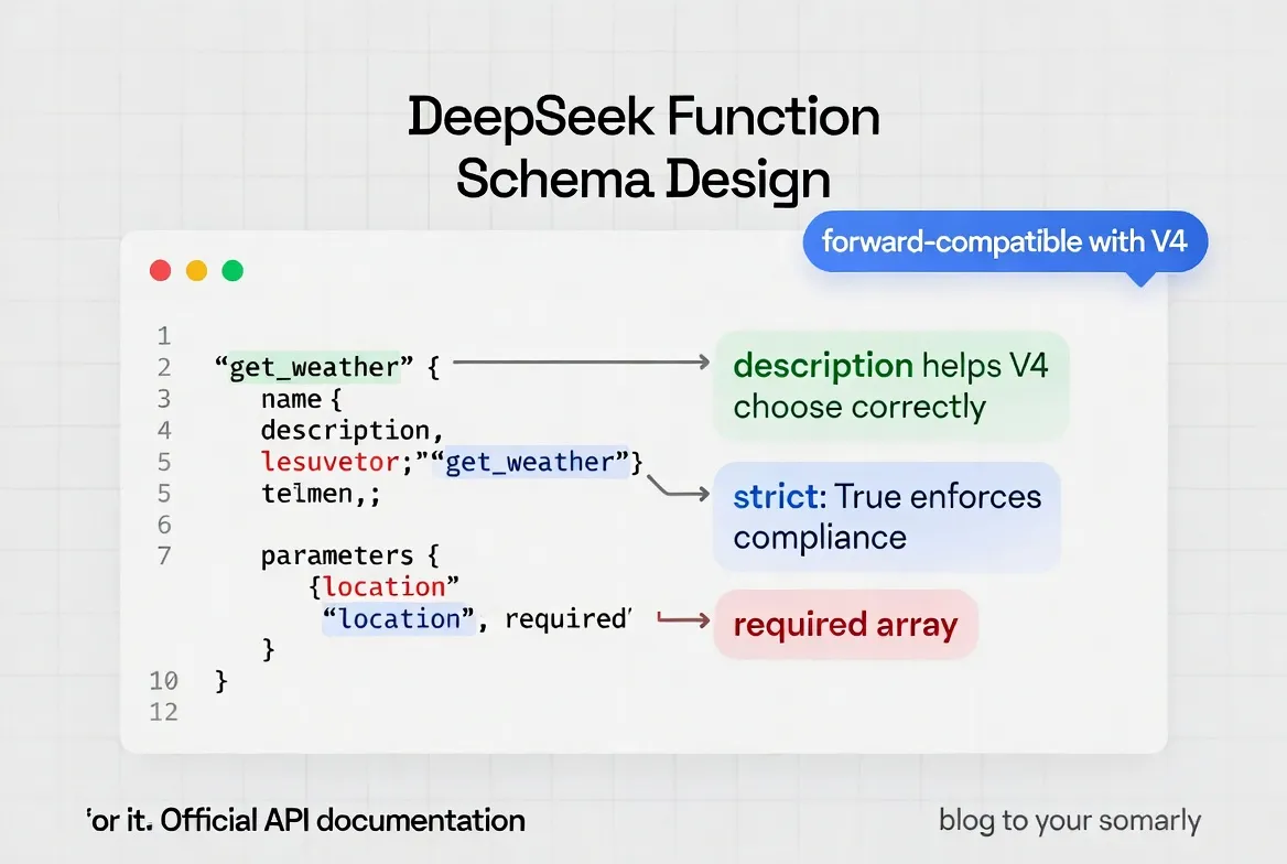 What this means practically: your existing function schemas will work. But V4 introduces tighter reasoning over tool selection, which means poorly described functions will be called at wrong times more often than before — the model is more agentic, not more forgiving.