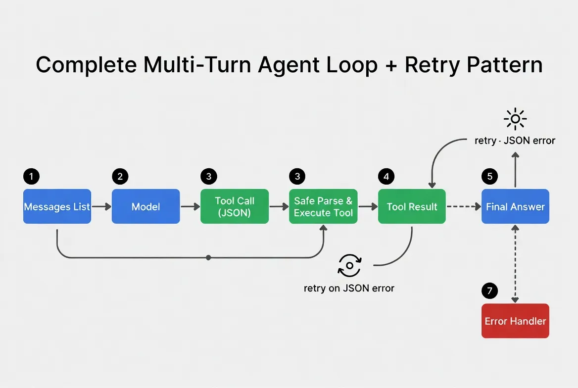 This four-step cycle is the foundation of every agent loop. If your schema is sloppy, the loop breaks. If your retry logic is absent, one bad parse kills the run.
