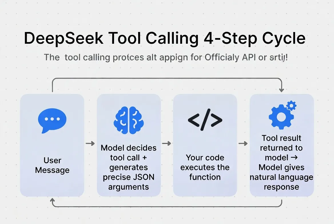 DeepSeek's Tool Calls feature allows the model to call external tools to enhance its capabilities. The flow is always: user message → model decides to call tool → your code executes → result returned to model → model responds in natural language.
