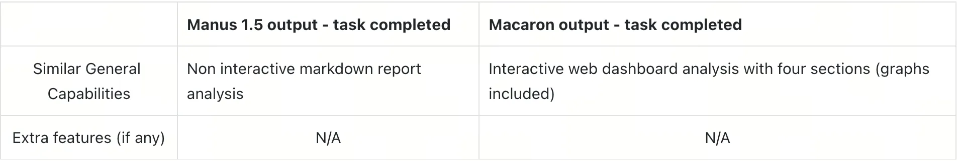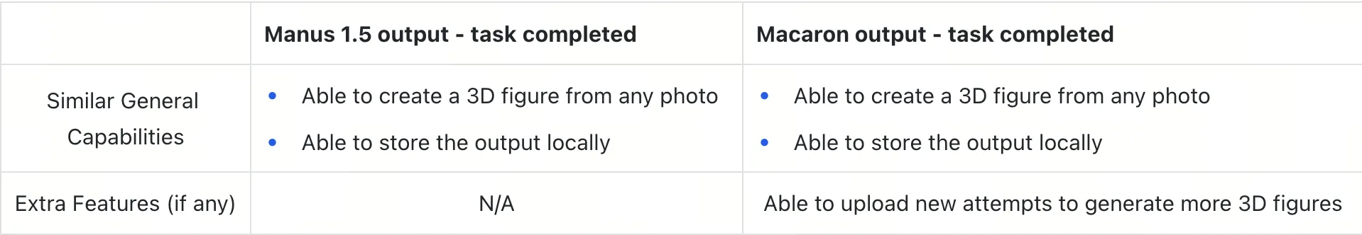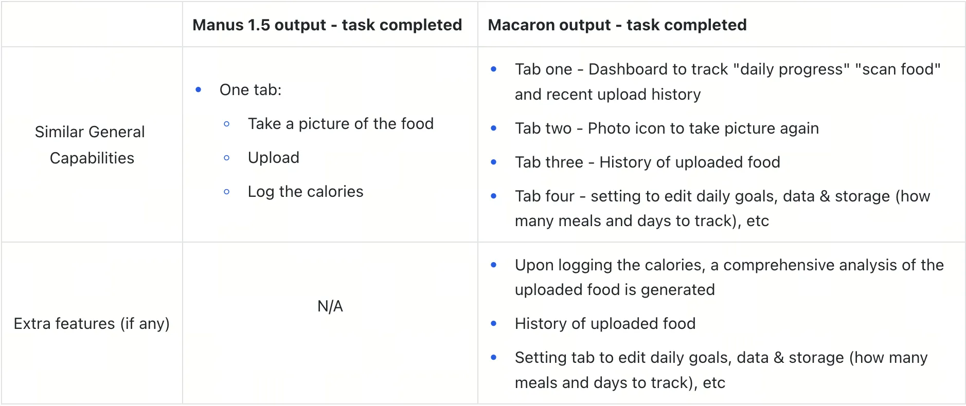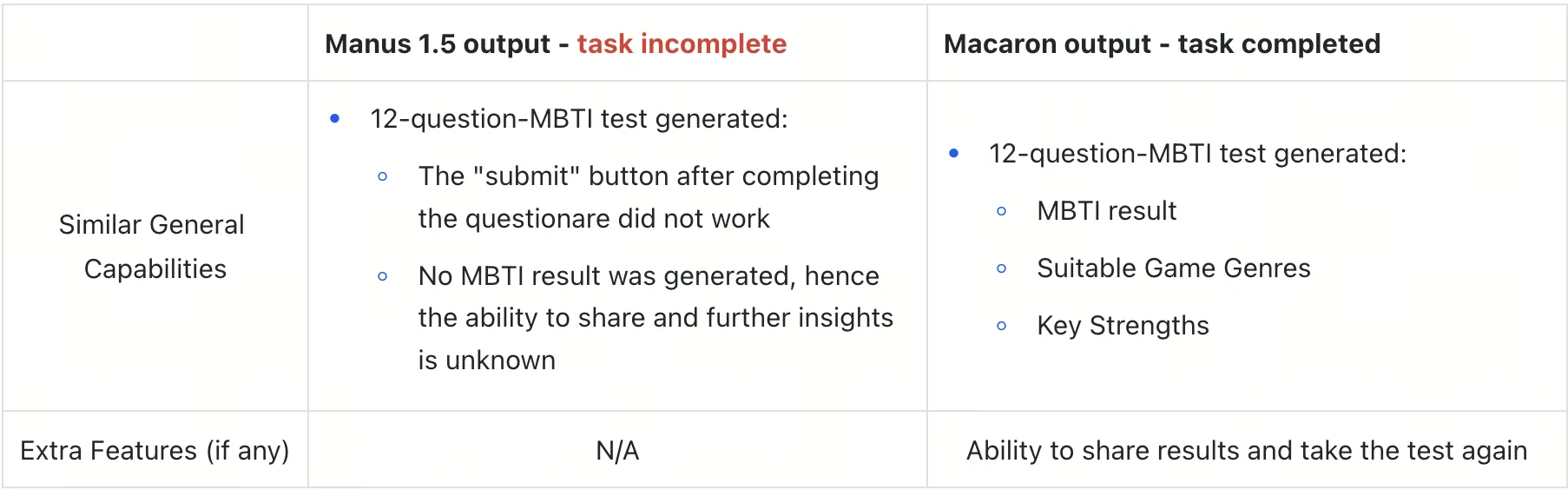 Macaron’s Playbook doesn’t just offer one-click downloads. It also transparently shows the natural-language prompt used to generate each mini-app. We took five example prompts from the Playbook and gave those exact same prompts to Manus 1.5, to directly compare how each system performs. For each test, we looked at whether the task was completed, what features the generated app had, and how the user experience felt. Below we summarize the results of Macaron and Manus side by side: