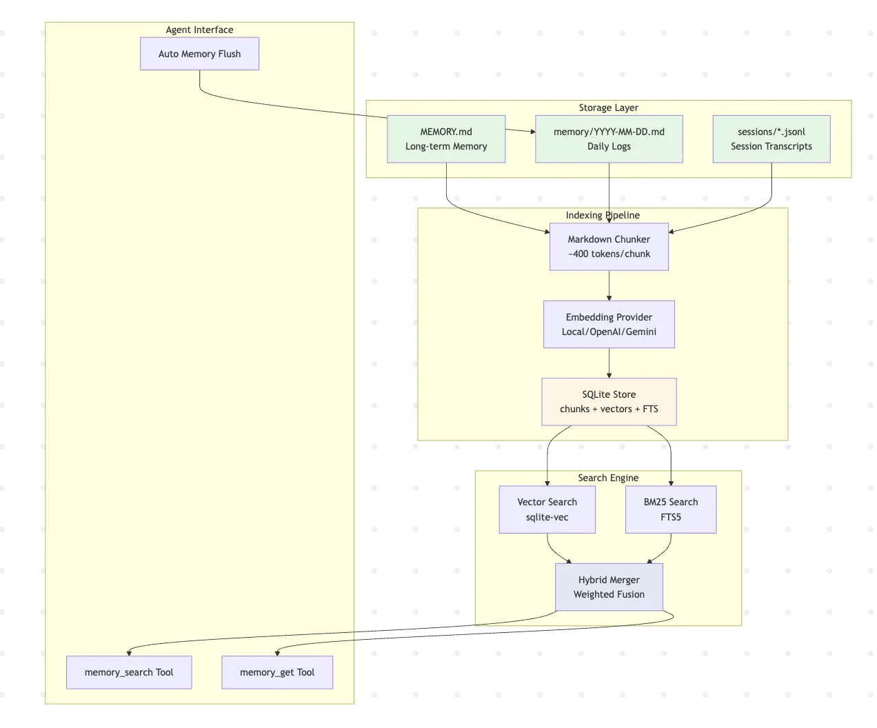 Here's where it gets technically interesting. OpenClaw doesn't retrieve memory with a simple keyword search. It runs a hybrid search architecture combining two methods: