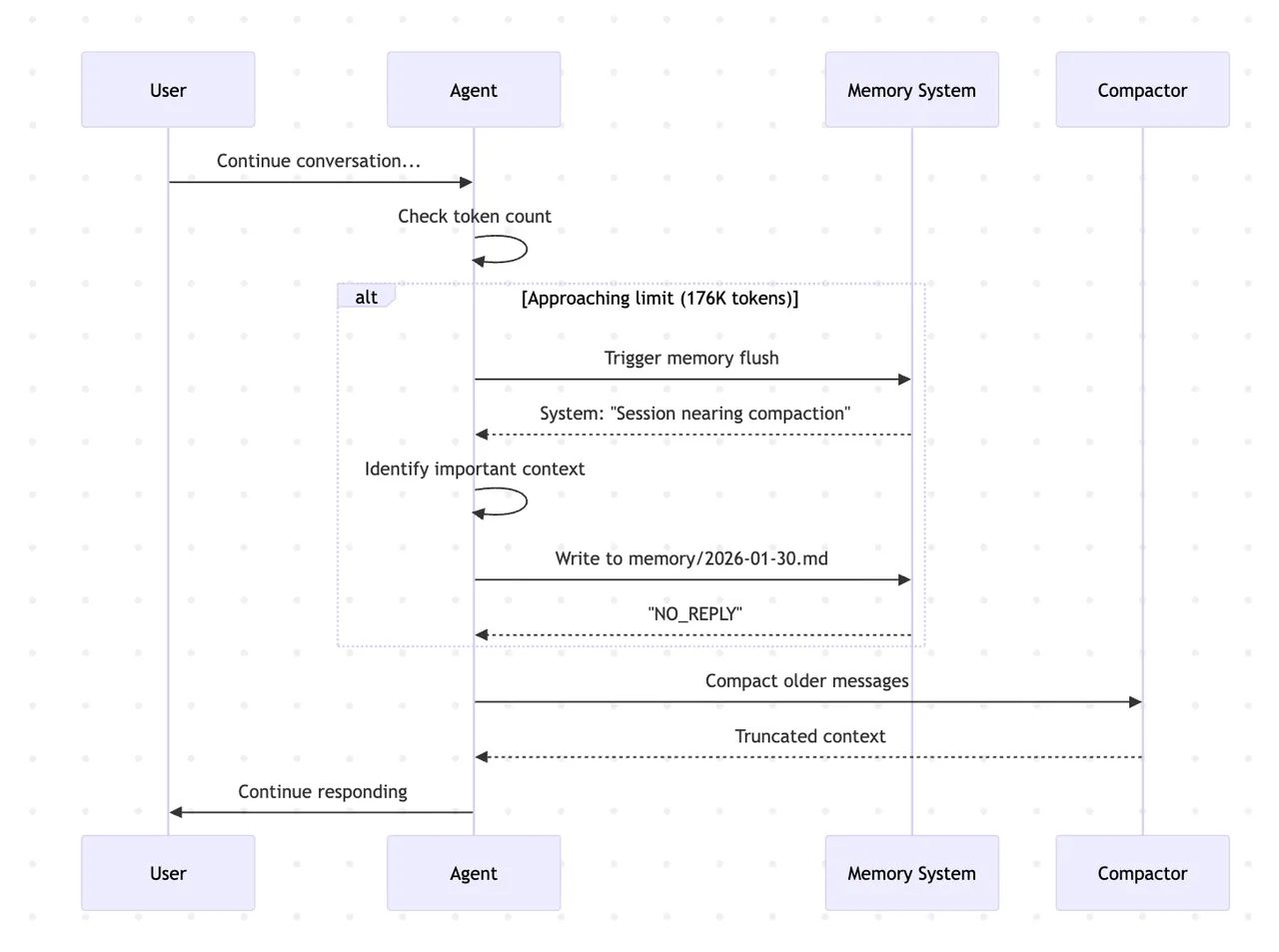 One feature I found genuinely clever: automatic memory flush before context compaction. When a long session approaches the context window limit, OpenClaw triggers a silent background agent turn that writes important context to disk before compaction discards it. You don't lose the thread of a two-hour work session just because the context window hit its ceiling.