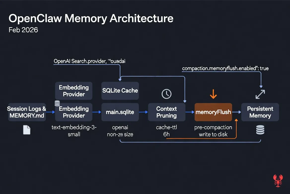 This config — from Molt Founders' OpenClaw runbook — wires together three pieces that need to work in concert: search indexing, context pruning, and pre-compaction memory flush. Getting just one of the three right still leaves you with the "why did it forget that" problem.