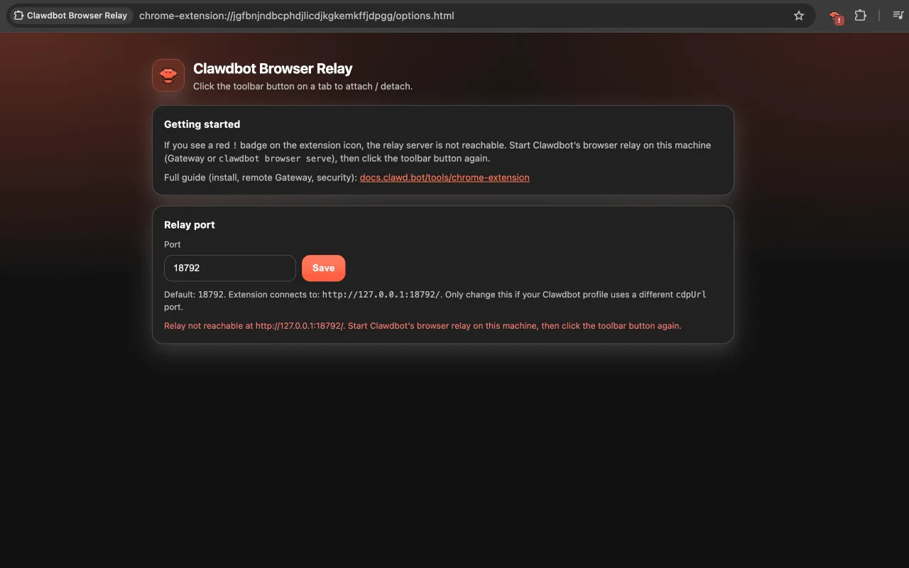 If you see !: the relay server isn't running on this machine, or the gateway token is wrong. Open the extension Options page — it shows relay reachability status and where the handshake is failing.