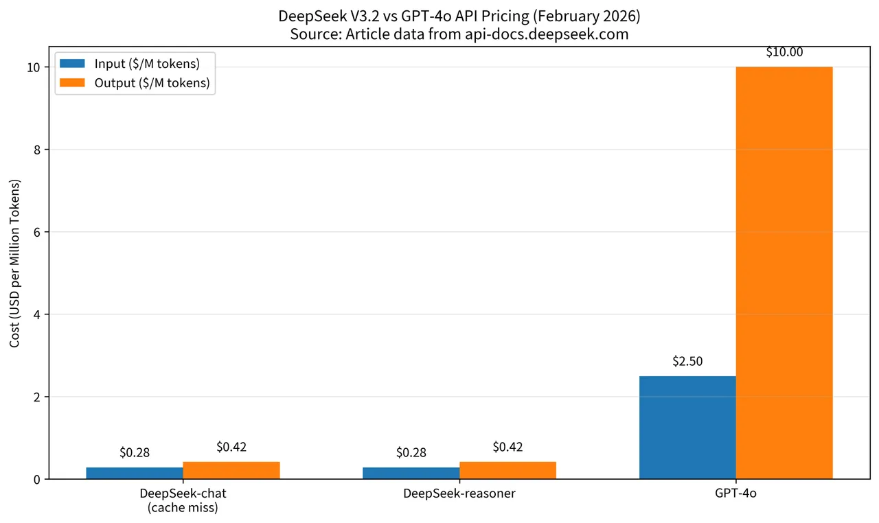 Here's the part that made me do a double-take. Current DeepSeek V3.2 API pricing (as of February 2026):