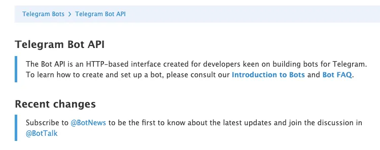 For reference, Telegram's official docs on bot creation and the Bot API are solid and concise: see the Telegram Bot API overview and Intro to bots.
