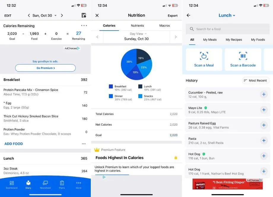 MyFitnessPal's free tier allows manual food logging, basic calorie tracking, and goal setting. Barcode scanning, photo scanning, voice logging, custom macros by gram, and ad removal all require Premium. The free experience shows ads throughout the app.